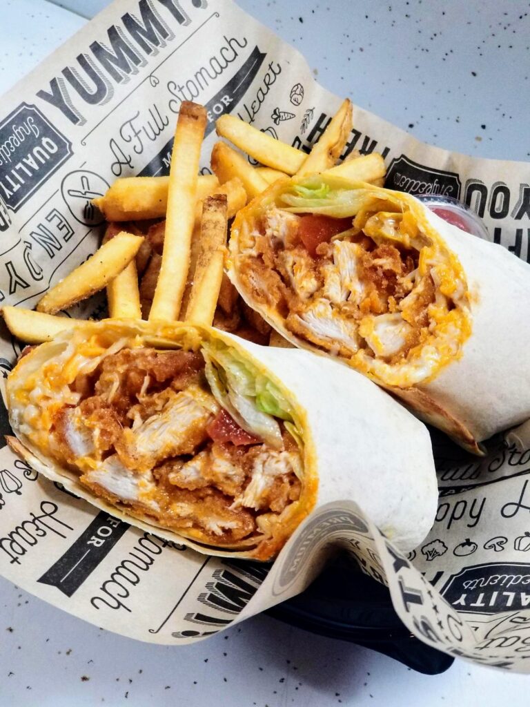 Spicy chicken tossed in hot sauce and layered with jack/cheddar cheese, nacho cheese, bleu cheese, & crushed tortilla chips. Wrapped up in a large flour tortilla