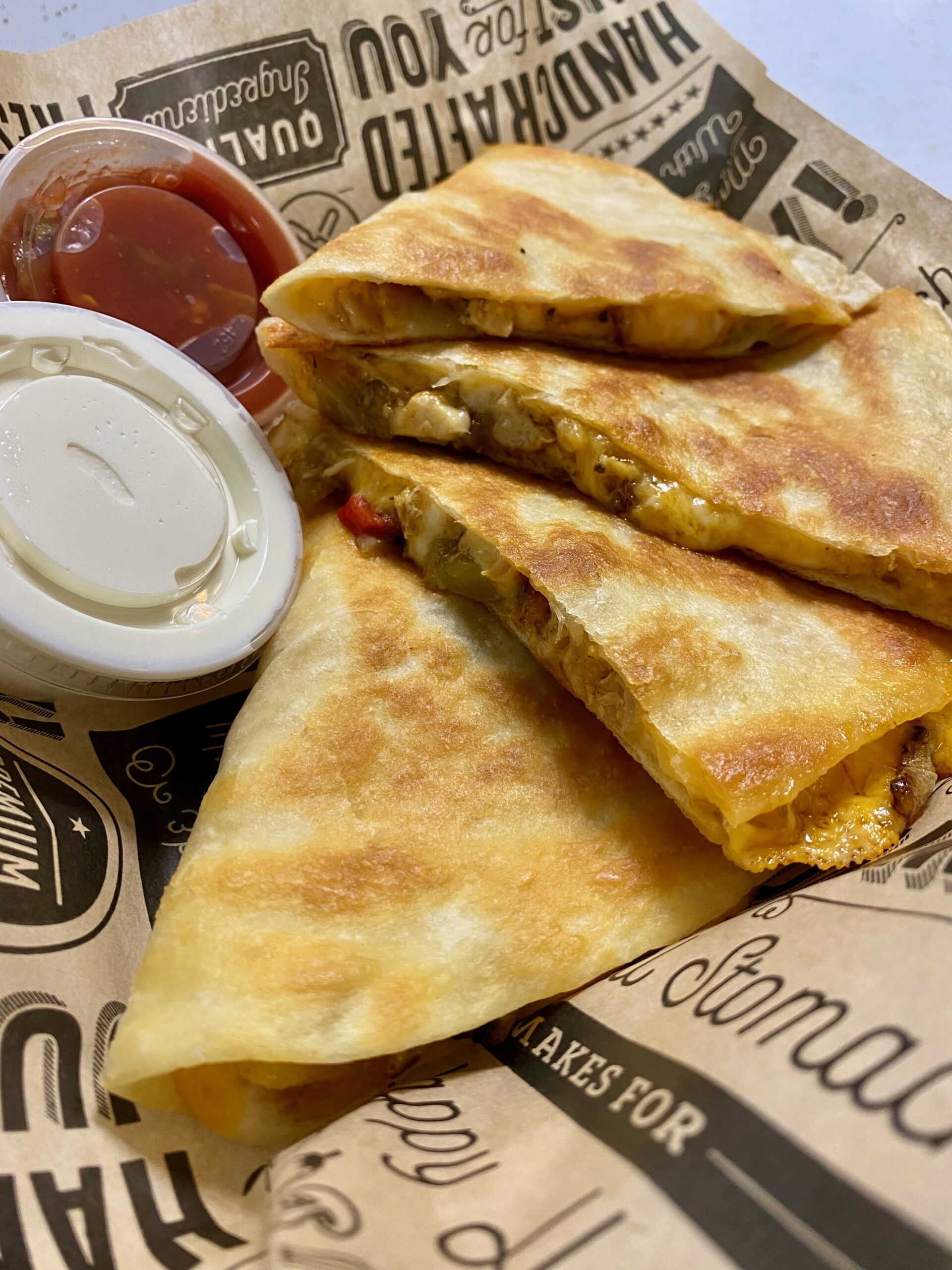 A 12” flour tortilla filled with your choice of our spicy chicken or Midwestern Beef, peppers & onions, and melted jack/cheddar cheese. Severed with a side of sour cream and salsa. Chicken | Steak | Cheese