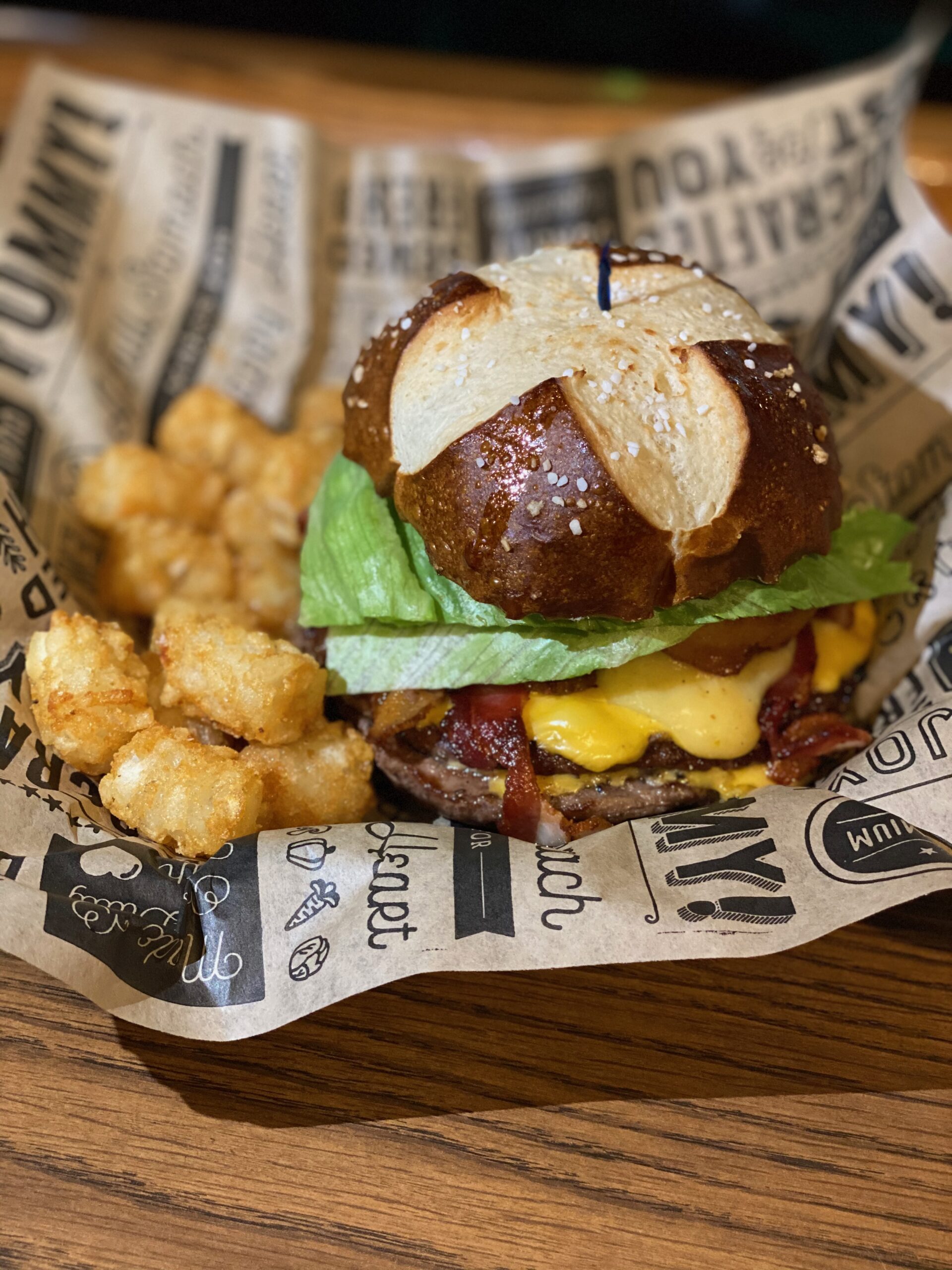 Two juicy ¼ pound patties, melted American Cheese and smothered in our signature beer cheese. Between a warm pretzel bun and topped off with crisp bacon, lettuce, tomato, and an onion ring for good measure