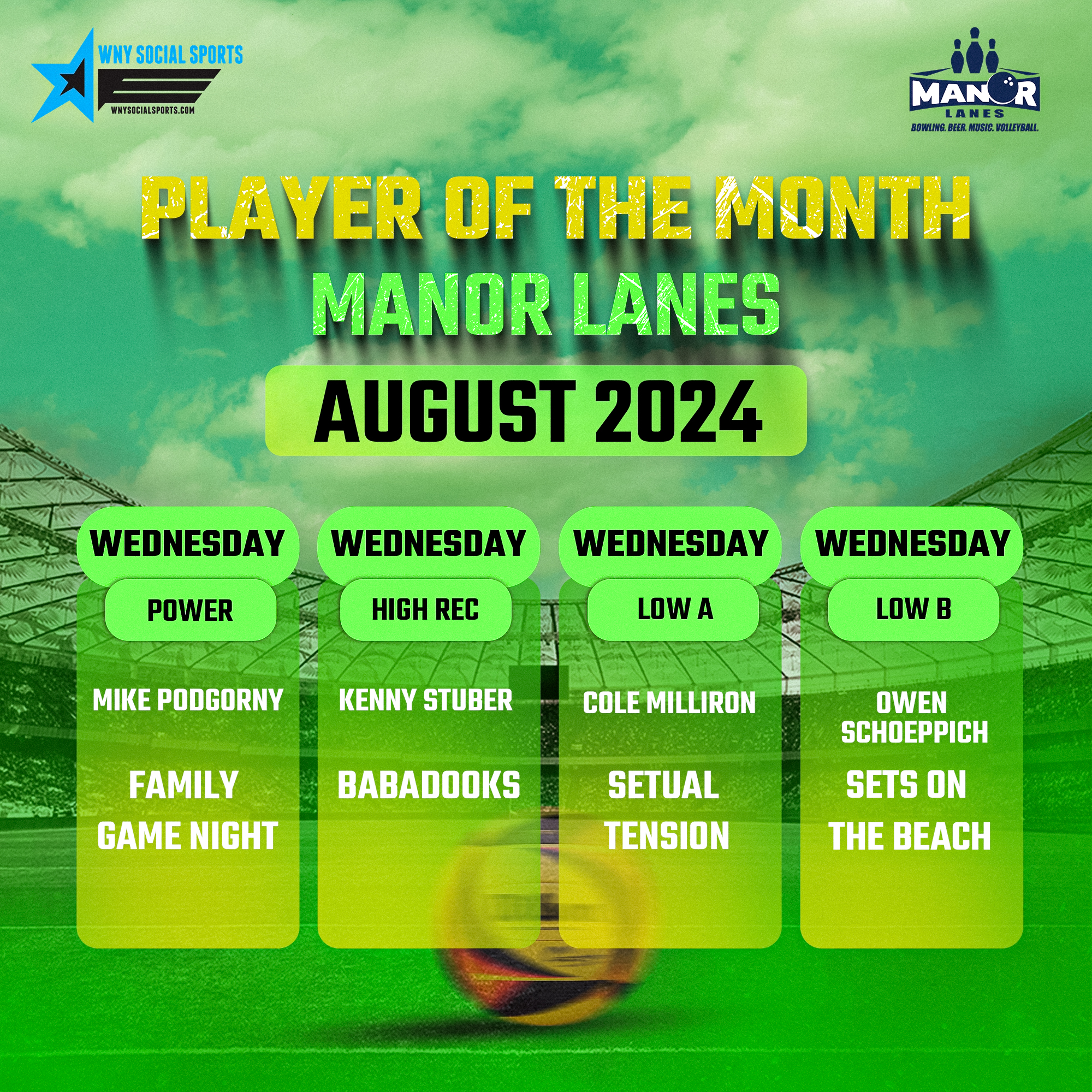 An epic event at our brand new facility! Thu Fri August Player of the month mon tue wed August 2024 | manor lanes wny social sports